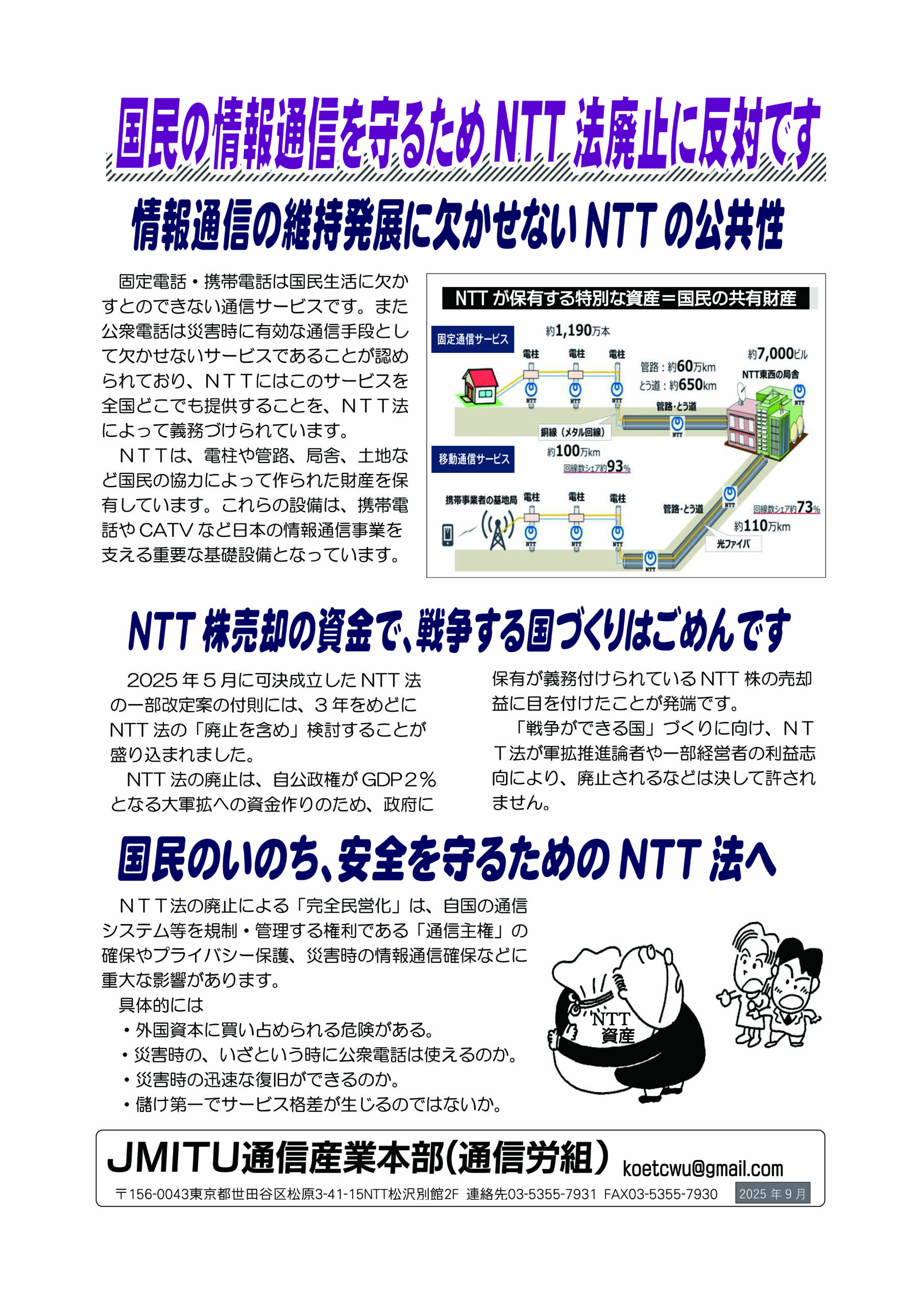 NTT法が軍拡論者や一部の経営者の利益志向により廃止されるなどは決して許されません。