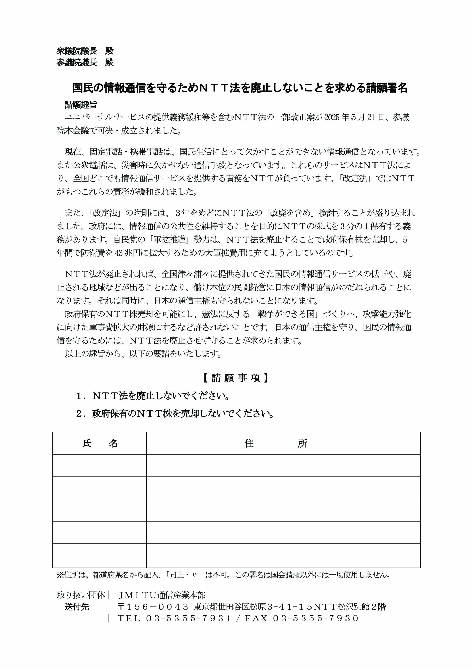 そのために通信産業本部は、「NTT法を廃止しないことを求める請願署名」に取り組んでいます。